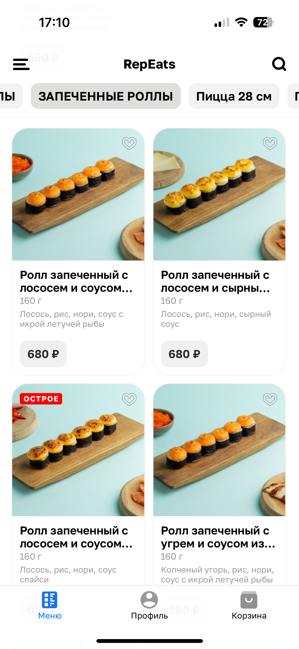 Королевский ролл с лососем и угрем; Ролл, запеченный с креветкой и сыром пармезан; Ролл, запеченный с угрем и луком фри; Темпура-тако с угрем, Ролл "Лосось и соленая карамель"; Запеченные суши: с лососем 2 шт., с тунцом 2 шт., с угрем 2 шт., с гребешком 2 шт.