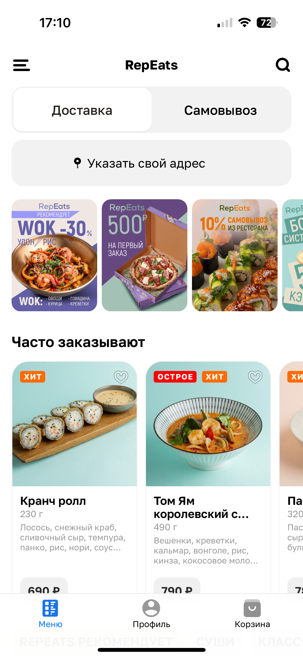 Филадельфия с лососем; Калифорния с крабом; ролл "Лосось, клубника, базилик"; Ролл с лососем, авокадо и чуккой; ролл с тунцом и соусом юдзу; суши: спайси с лососем 2 шт, с тунцом 2шт., с угрем 2 шт., с гребешком 2шт.