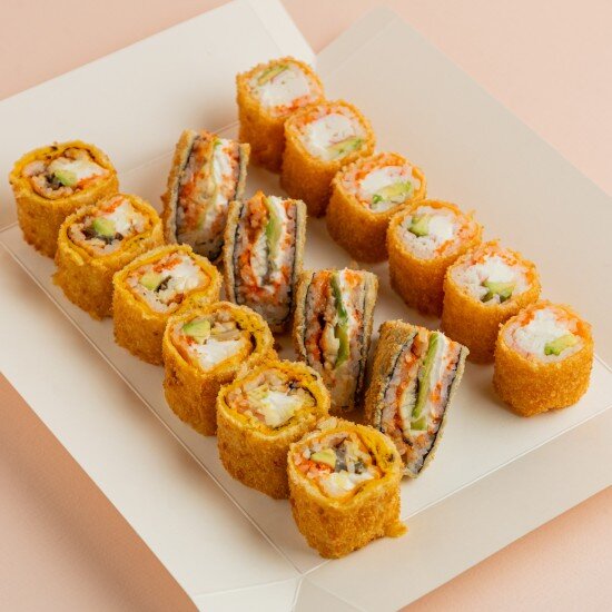 Запеченый ролл с угрем и луком фри, опаленный ролл с креветкой в панко, ролл с крабом и гребешком гриль