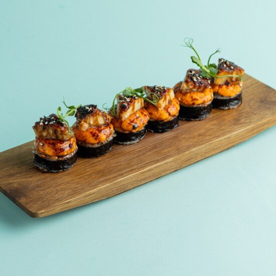 Ролл запеченный с угрем и соусом из икры летучей рыбы