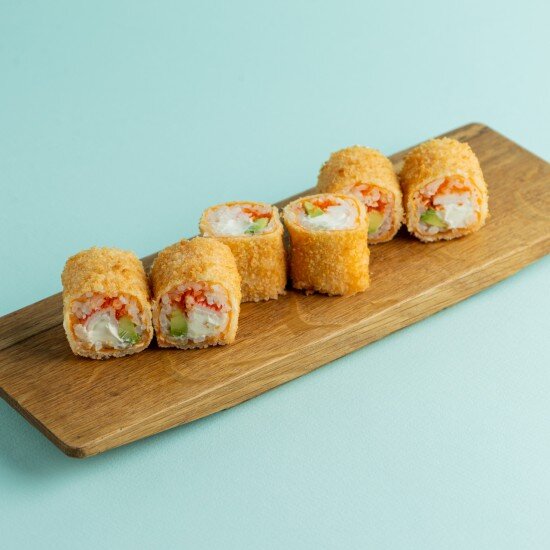 Ролл запеченный с лососем и соусом из икры летучей рыбы