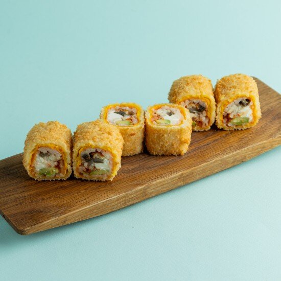Копченый угорь, икра масаго, авокадо, сливочный сыр, рис, нори, темпура, соус спайси цитрусовый
