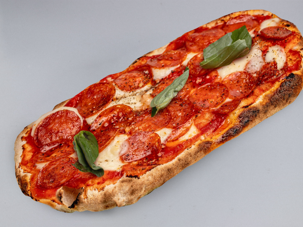 Колбаса пепперони, томатный соус, моцарелла, пармезан, базилик