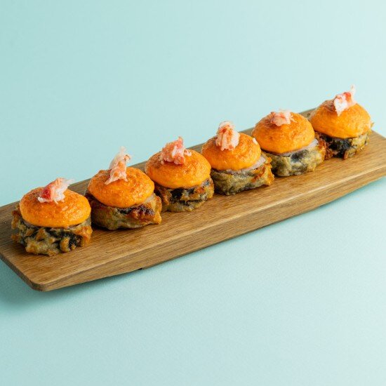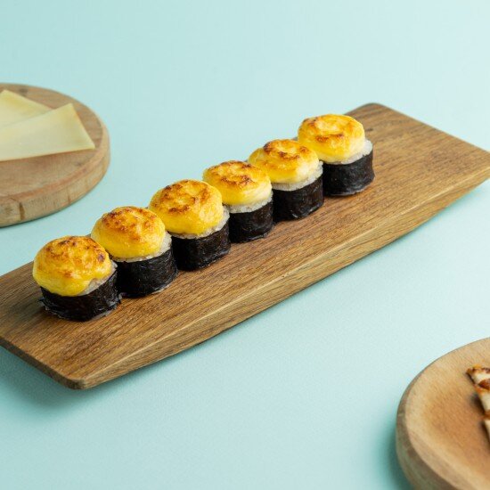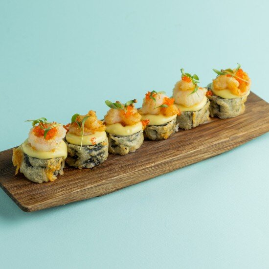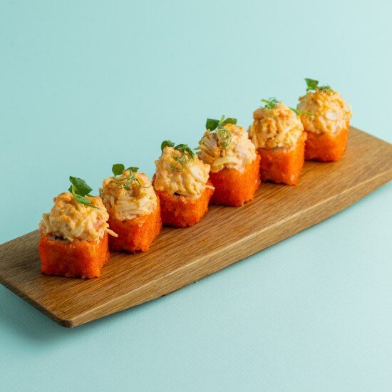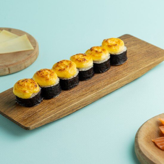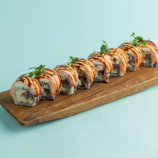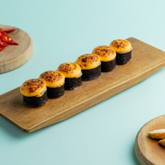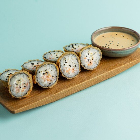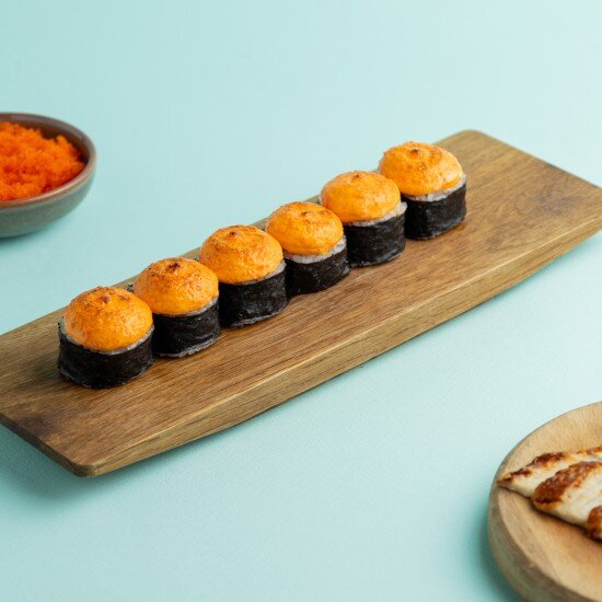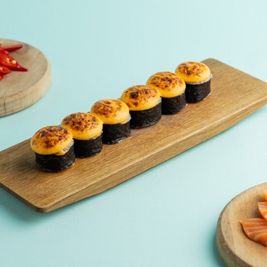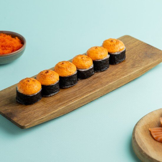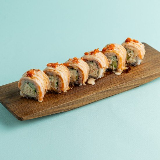 Ролл запеченный с лососем и соусом из икры летучей рыбы