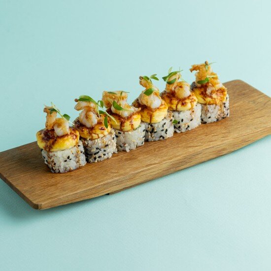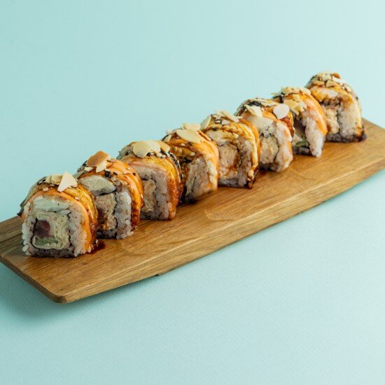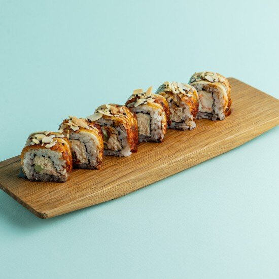 Ролл запеченный с угрем и соусом из икры летучей рыбы