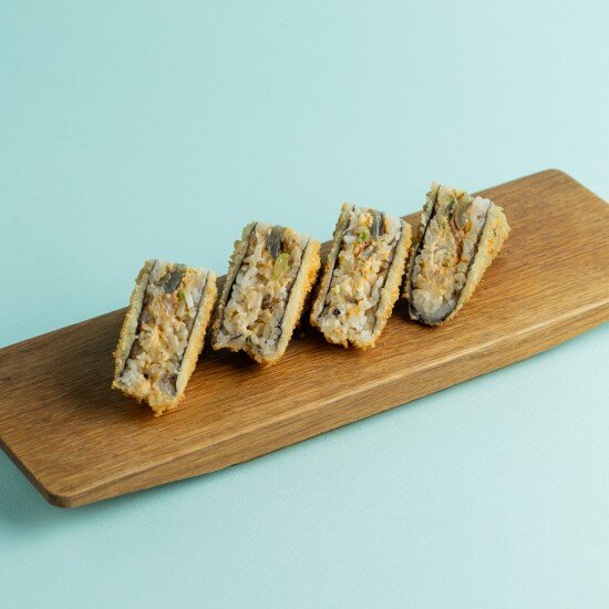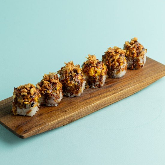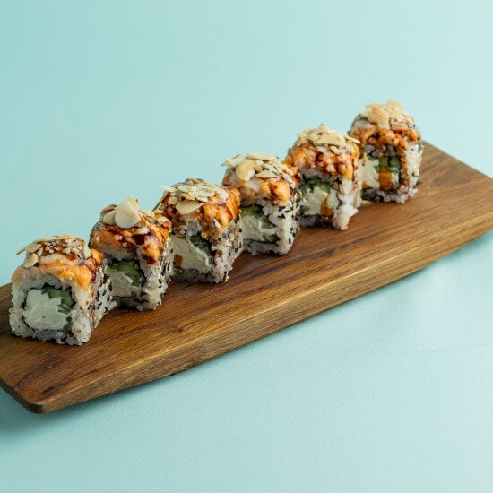 Рис нишики, нори, творожный сыр, огурцы, авокадо, кунжут, пармезан, унаги, лосось, соус спайси