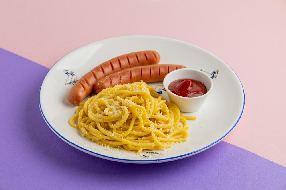 Паста, сосиски, пармезан, кетчуп, соль, масло сливочное