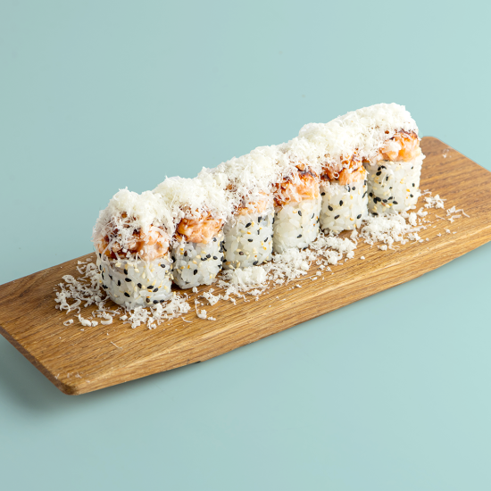 Ролл запеченный с лососем и соусом из икры летучей рыбы