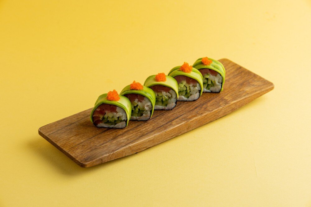 Тунец, лосось, креветки, кальмар, огурец, авокадо, тобико, соус понзу, нори