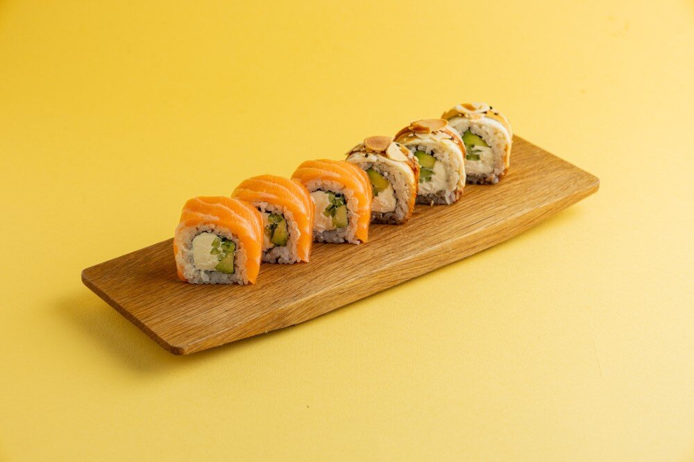 Лосось, угорь, сыр сливочный, огурец, авокадо, соус унаги, кунжут, миндаль, рис, нори