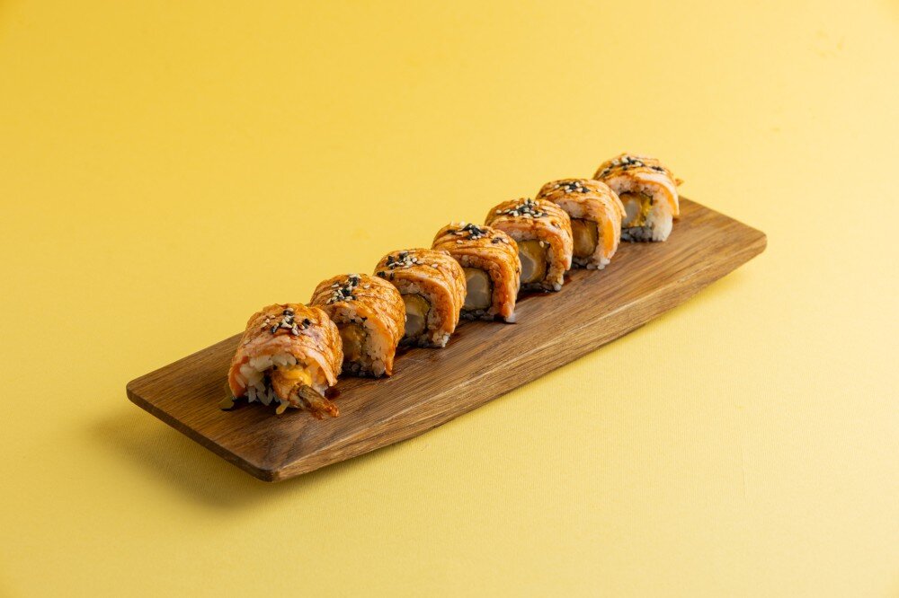 Тигровые креветки в панировке, лосось, манго, рис, нори, соус унаги, кунжут, соус спайси