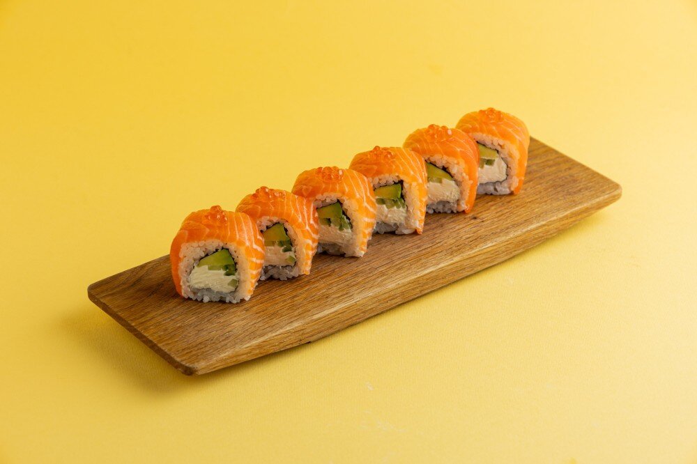 Лосось, авокадо, огурец, сливочный сыр , красная икра, рис, нори