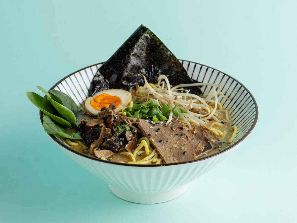 Мисо бульон, лапша рамен, лук зеленый, говядина, грибы шиитаке, яйцо маринованое, ростки сои, водоросли нори, кунжут