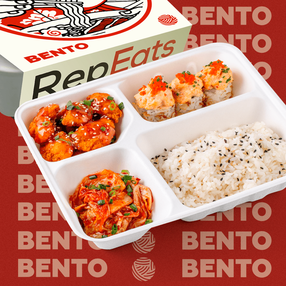 Курица в темпуре в чили-сладком соусе, рис, капуста кимчи, ролл Бонито со спайси креветкой (3 шт.), зеленый лук