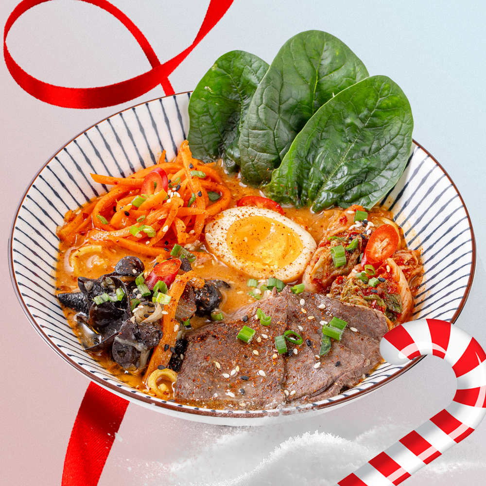 Лапша рамен, бульон рамен мисо, яйцо маринованное, морковь по-корейски, грибы моэр, пекинская капуска кимчи, шпинат, кунжут, зеленый лук, перец чили, говядина