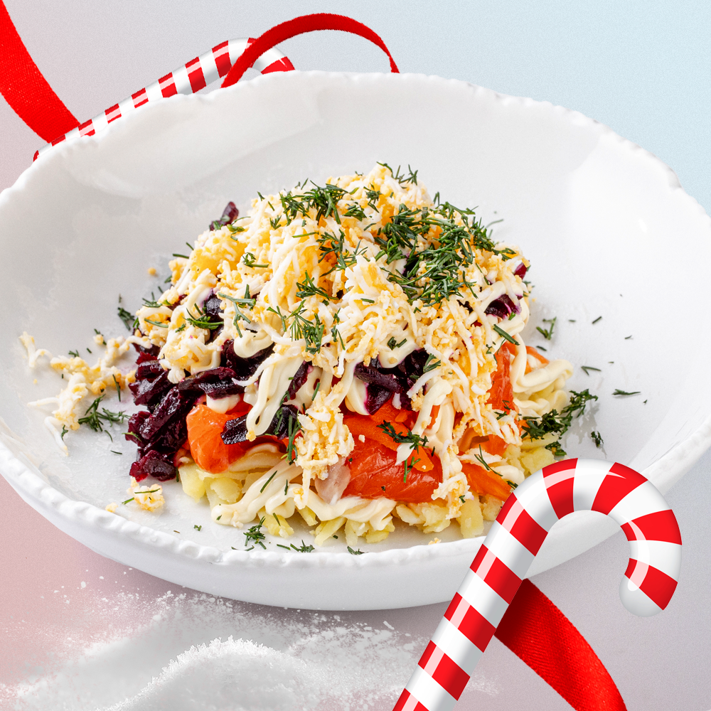 Картофель, морковь, лосось, свекла отварная, яйцо куриное, майонез, укроп