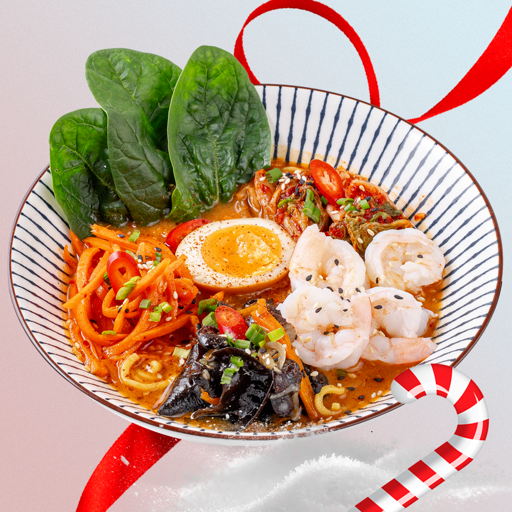 Лапша рамен, бульон рамен мисо, яйцо маринованное, морковь по-корейски, грибы моэр, пекинская капуска кимчи, шпинат, кунжут, зеленый лук, перец чили, креветки