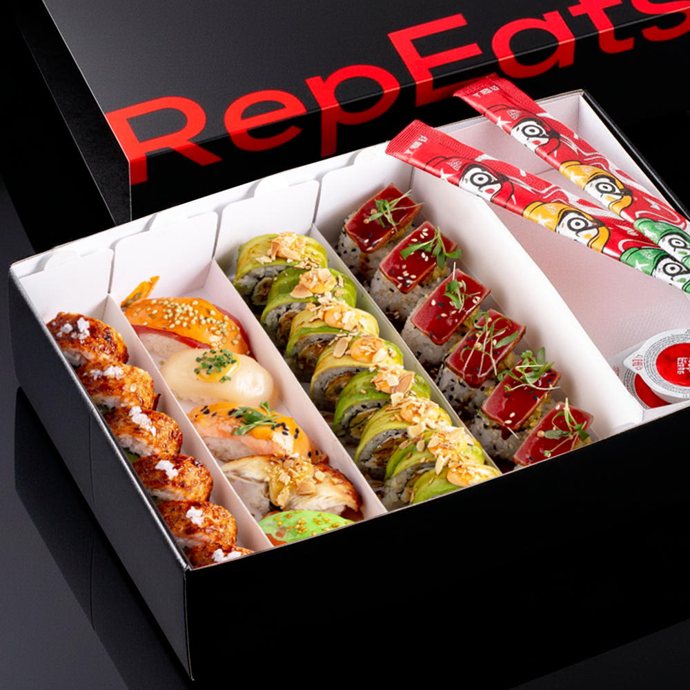 Premium Box в составе которого: Big roll с угрем и авокадо, Ролл с тунцом татаки, Ролл карамельный лосось, Суши лосось под соусом Том Ям, Суши опаленный лосось под соусом васаби, Суши тунец под соусом кимчи, Суши угорь под соусом трюфельный унаги, Суши гребешок под трюфельным соусом