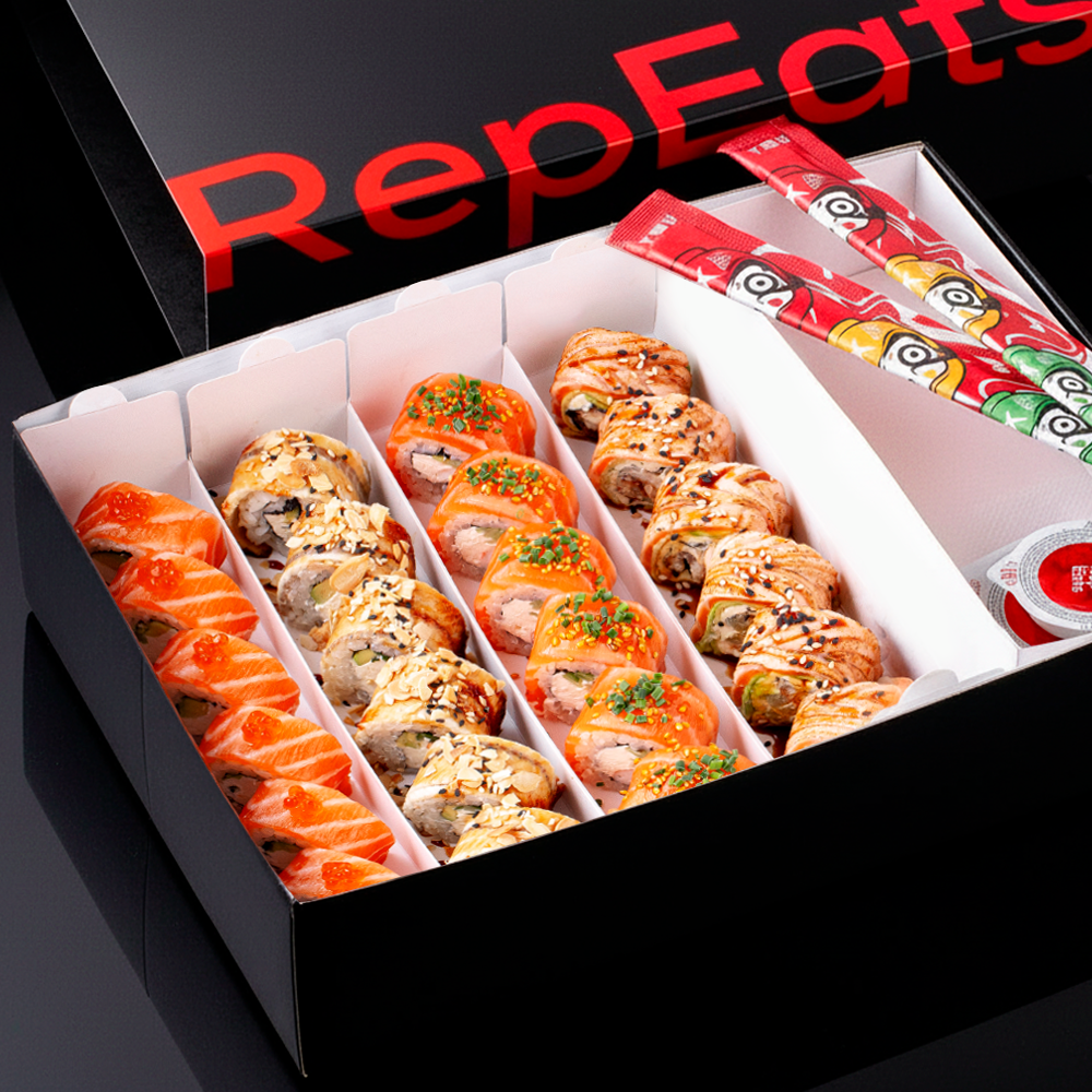 Premium Box в составе которого: Ролл лосось-креветка, Филадельфия с угрем, ролл авокадо King с лососем и угрем, Филадельфия с икрой и авокадо