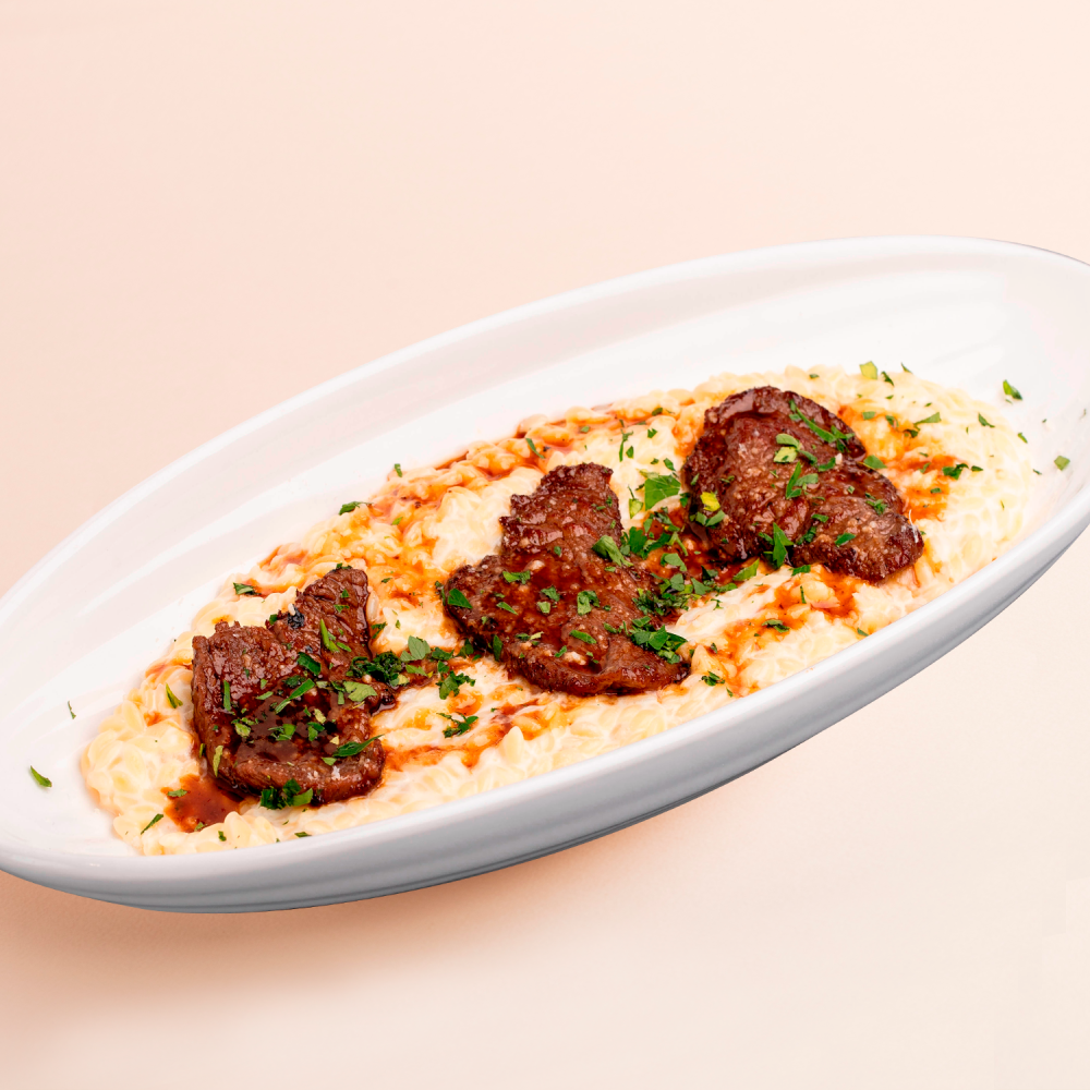Говядина, соус демиглас, сливки, пармезан, соль, перец, микрозелень, куриный бульон, петрушка, паста орзо, масло растительное