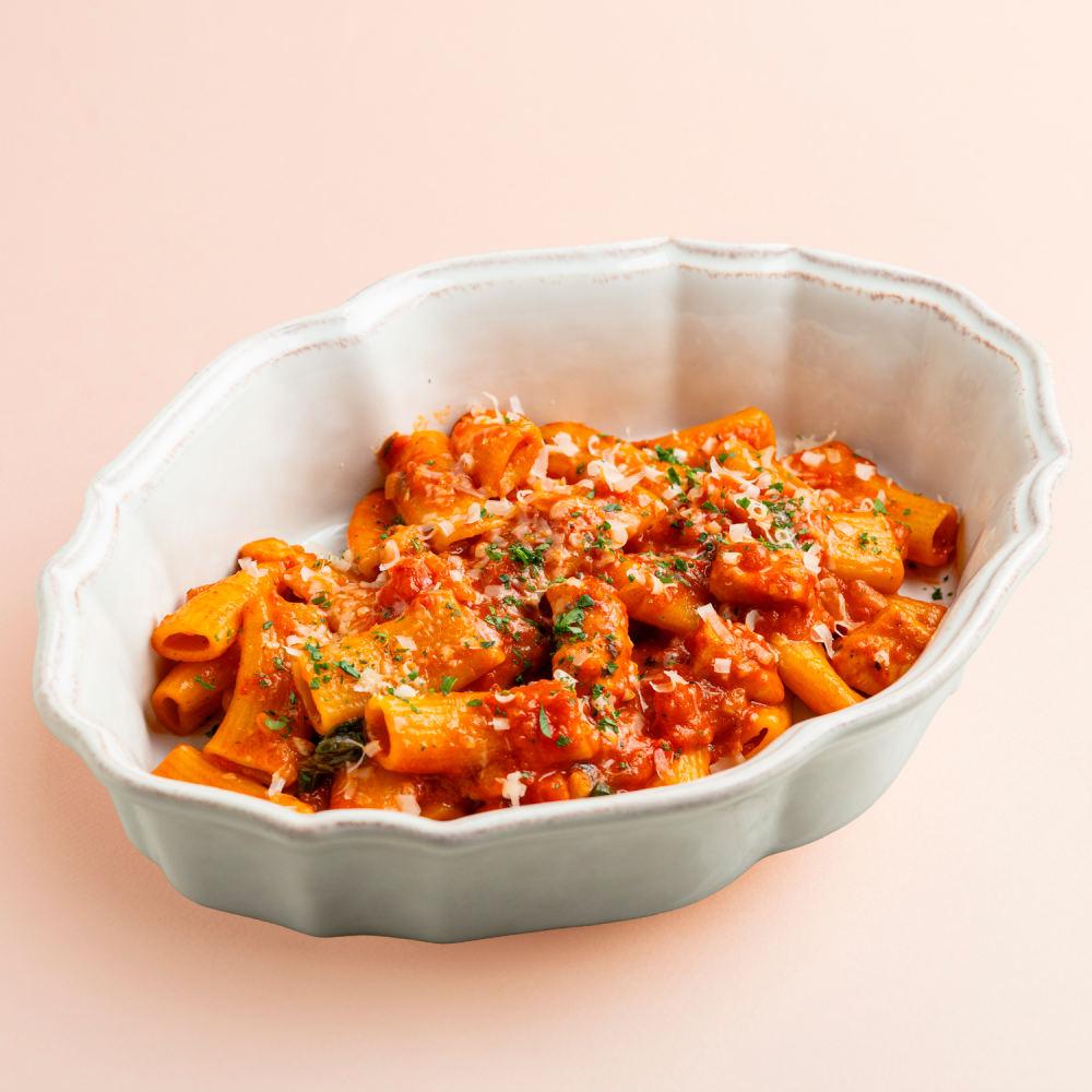 Куриная грудка, томаты, соус Аррабиата, петрушка, ригатони, пармезан, масло сливочное, чеснок