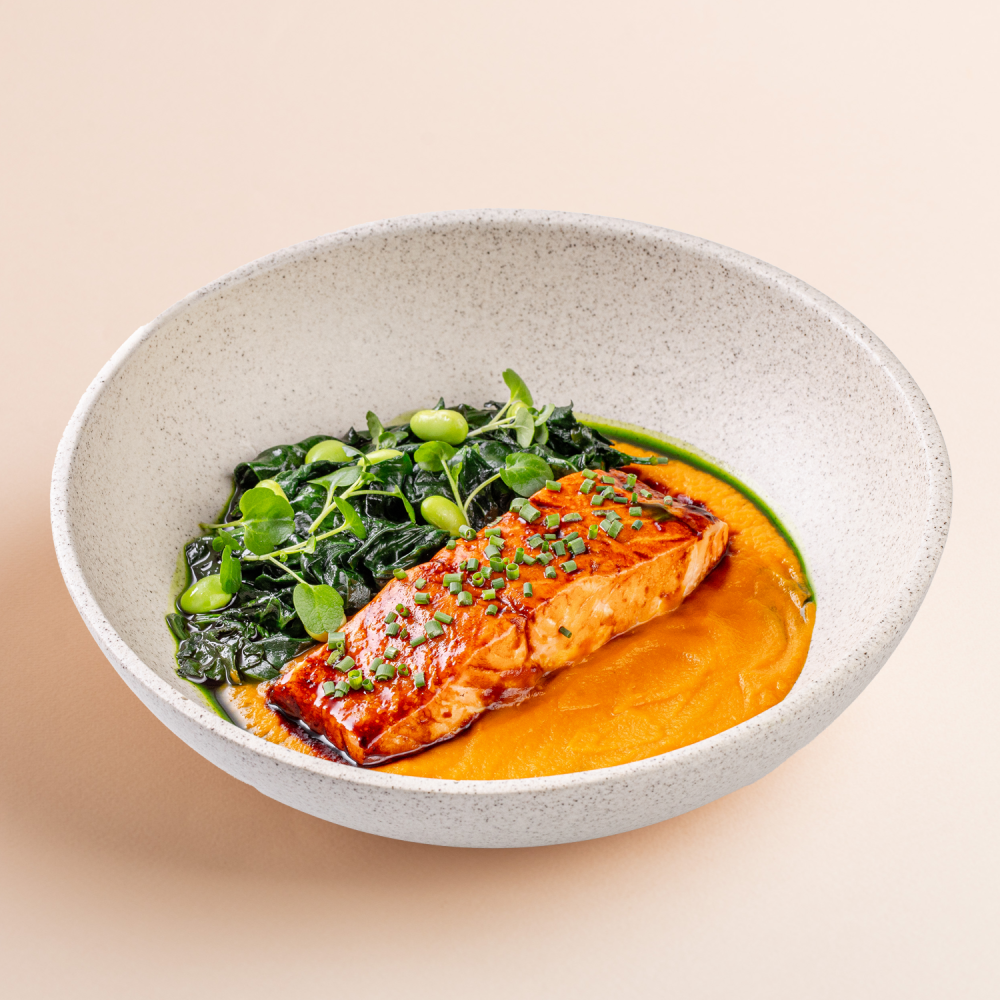 Лосось, шпинат, эдамаме, морковный крем, глазурь, масло растительное, микрозелень, шнитт