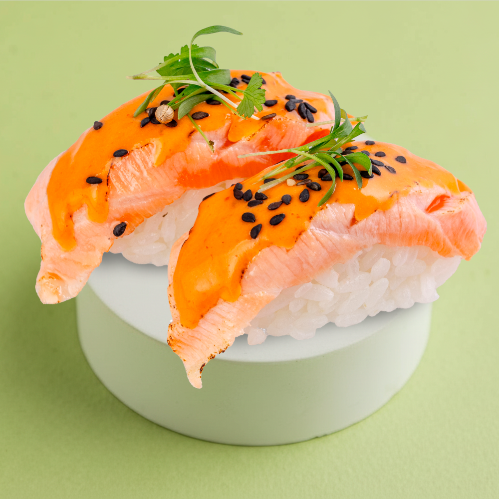 Рис, лосось, соус том ям, васаби, кунжут, микрозелень