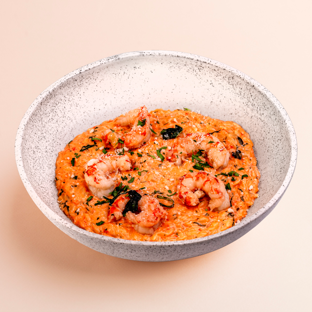 Лангустины, чеснок, базилик, бульон рыбный, белое вино, творожный сыр, масло сливочное, петрушка, пармезан, томаты, паста орзо