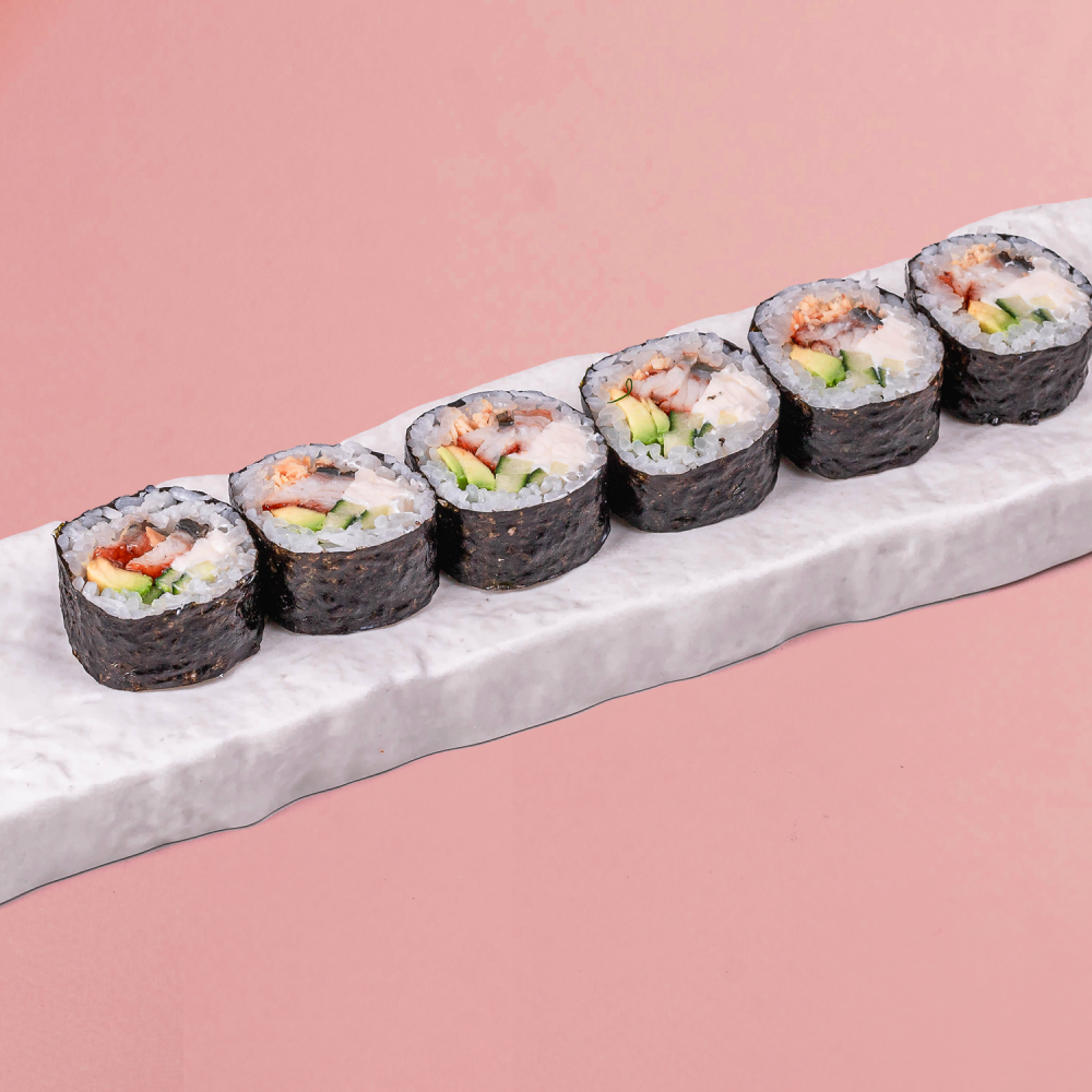Рис, нори, творожный сыр, угорь, огурцы, авокадо, миндаль