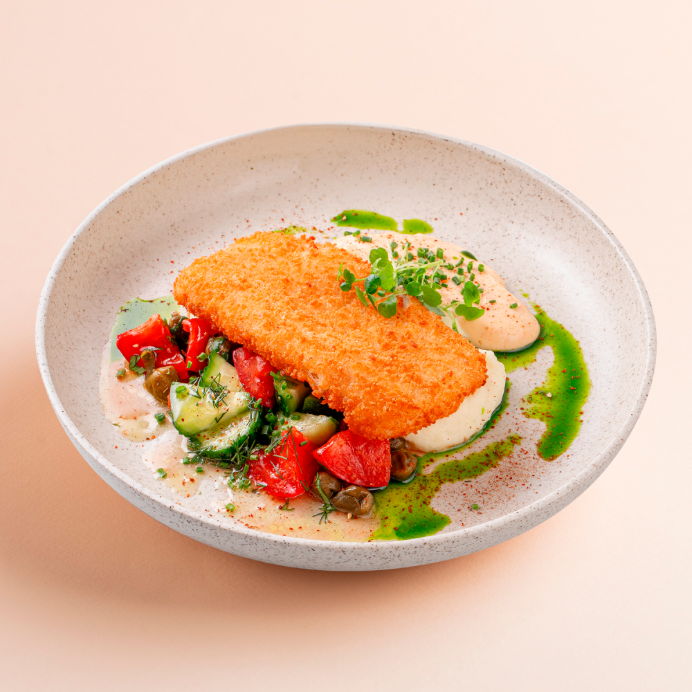 Треска, панировочные сухари, соль, перец, картофельное пюре, томаты, огурцы, каперсы, кинза, масло оливковое, сок лайма, соус тартар, соус чили сладкий, зеленое масло, микрозелень, шнитт