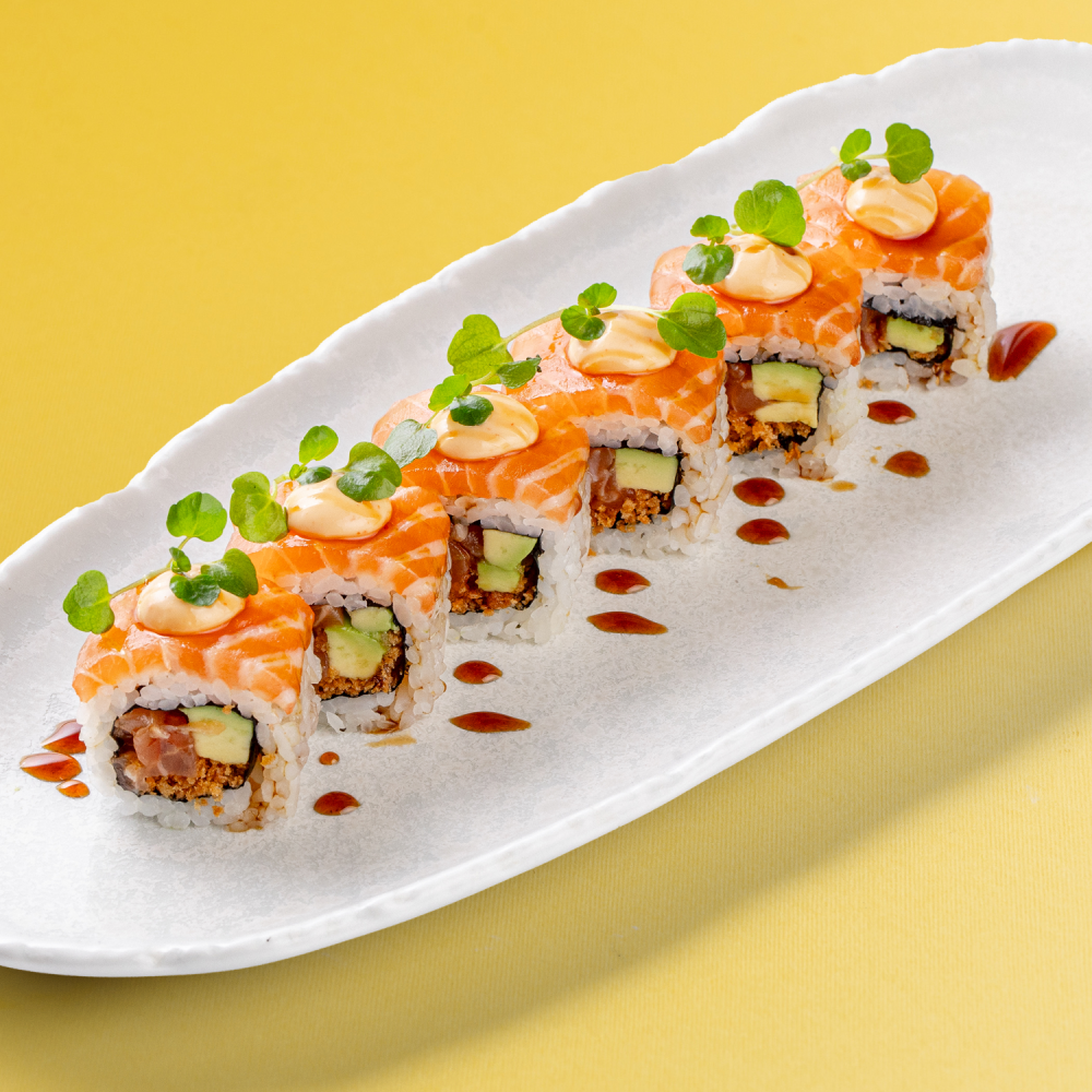 Лосось, соус юдзу, соус шрирача, темпурная крошка, авокадо, соус спайси, соус унаги, микрозелень, рис, нори