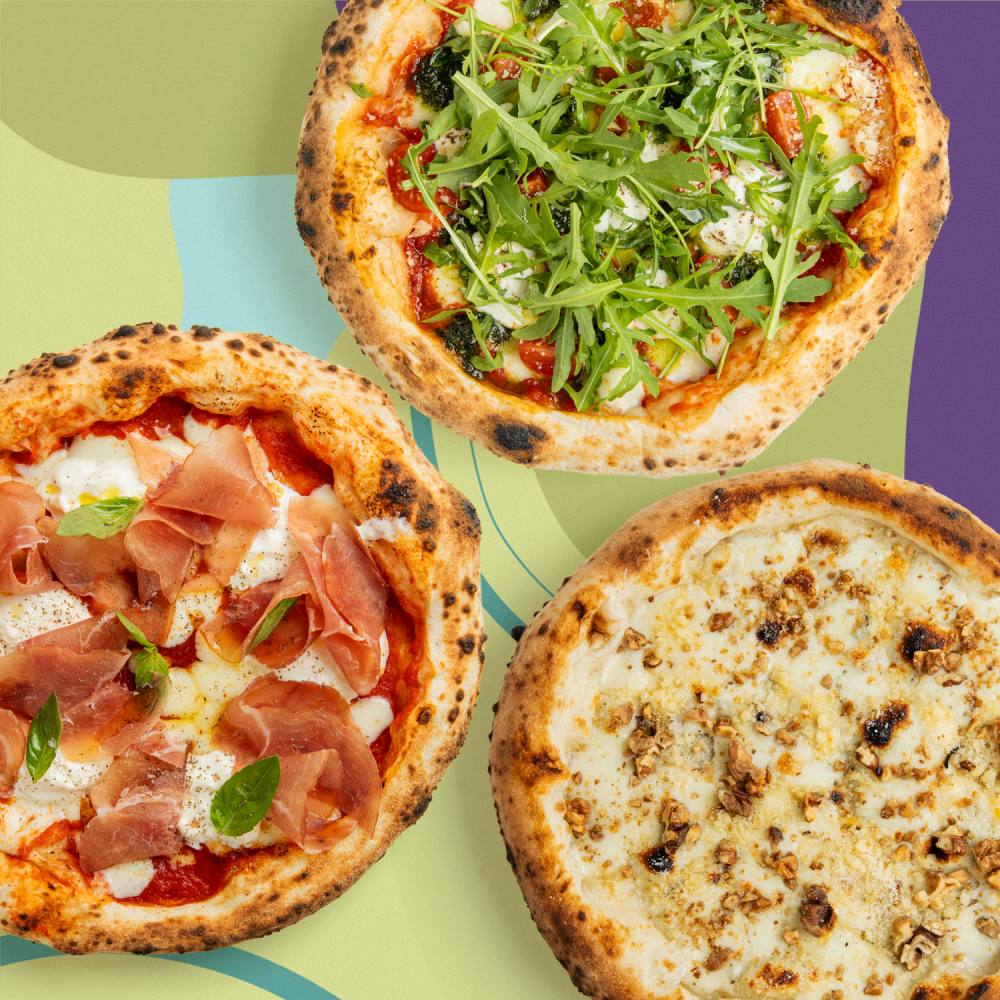 Пицца страчателла-парма 23 см; пицца четыре сыра 23 см; пицца страчателла, рукола, песто, томат 23 см