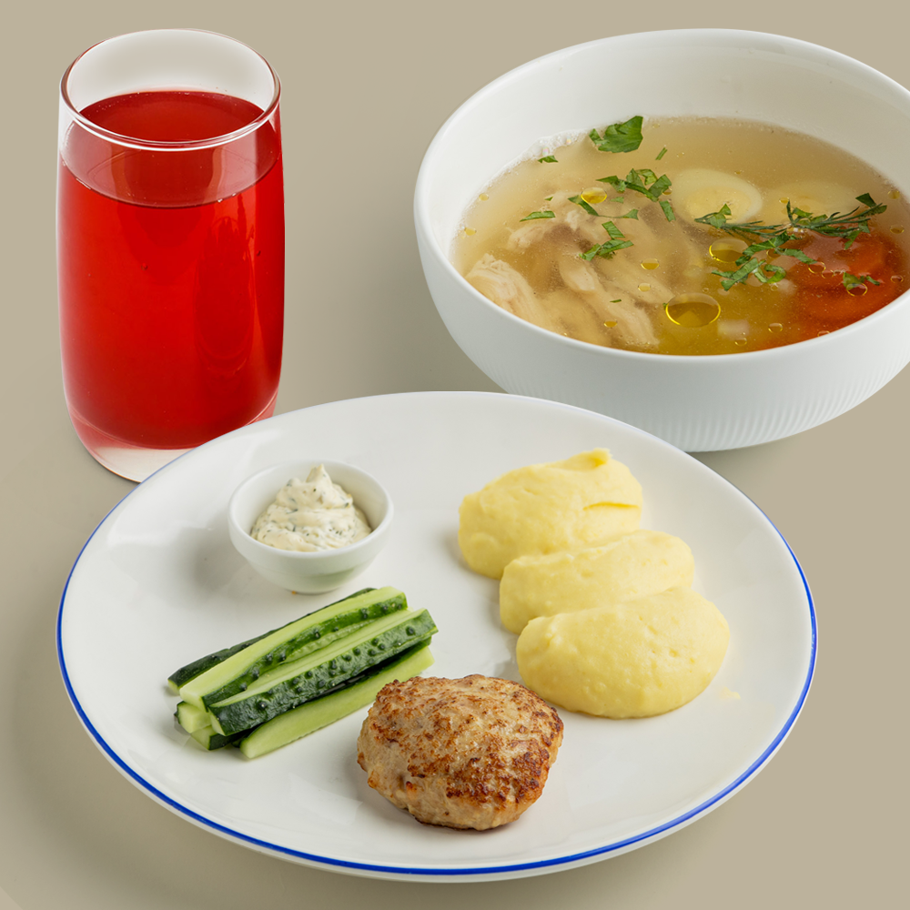 Куриный суп; Куриная котлета с пюре; Клюквенный морс