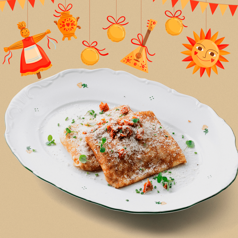 Мука пшеничная, масло сливочное, масло растительное, молоко, сахар, соль, яйцо куриное, тамбовский окорок, моцарелла, сметана, вяленый томат, пармезан