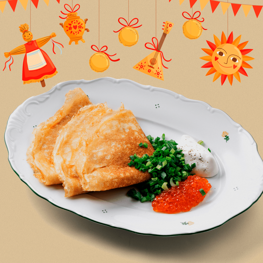 Мука пшеничная, масло сливочное, масло растительное, молоко, сахар, соль, яйцо куриное, красная икра, зеленый лук, сметана