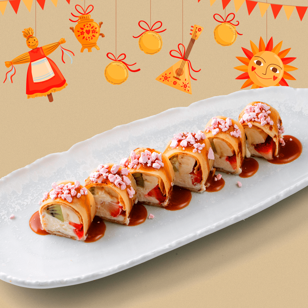 Фруктовый блинный ролл с соусом крем-чиз и карамелью