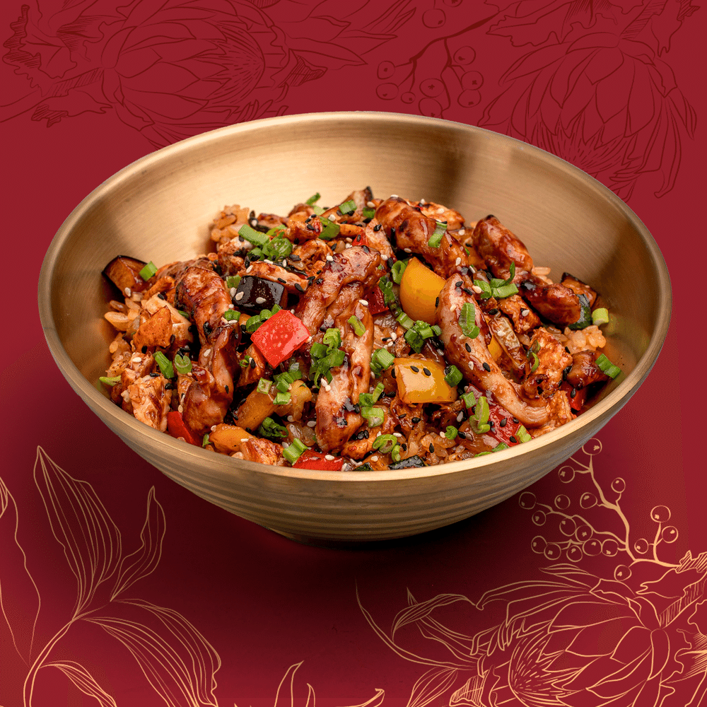 Курица, кабачок, паприка, лук репчатый, баклажаны, чеснок, соус устричный, яйцо, кунжут, лук зеленый