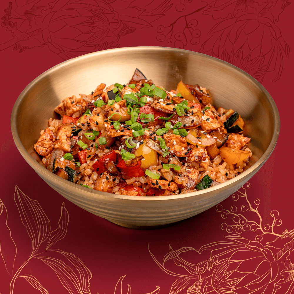 Кабачок, паприка, лук репчатый, баклажаны, грибы, чеснок, соус соевый, яйцо, кунжут, лук зеленый