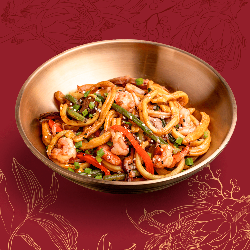 Креветки, соус острый терияки, паприка, шиитаки, лук репчатый, чеснок, стручки гороха, морковь, кунжут, лук зеленый