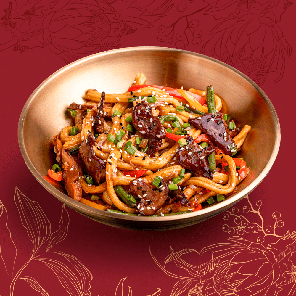 Говядина, соус острый терияки, паприка, шиитаки, лук репчатый, чеснок, стручки гороха, морковь, кунжут, лук зеленый