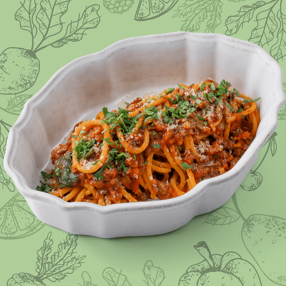 Спагетти, базилик, болоньез постный, масло оливковое, черный перец, соль, петрушка