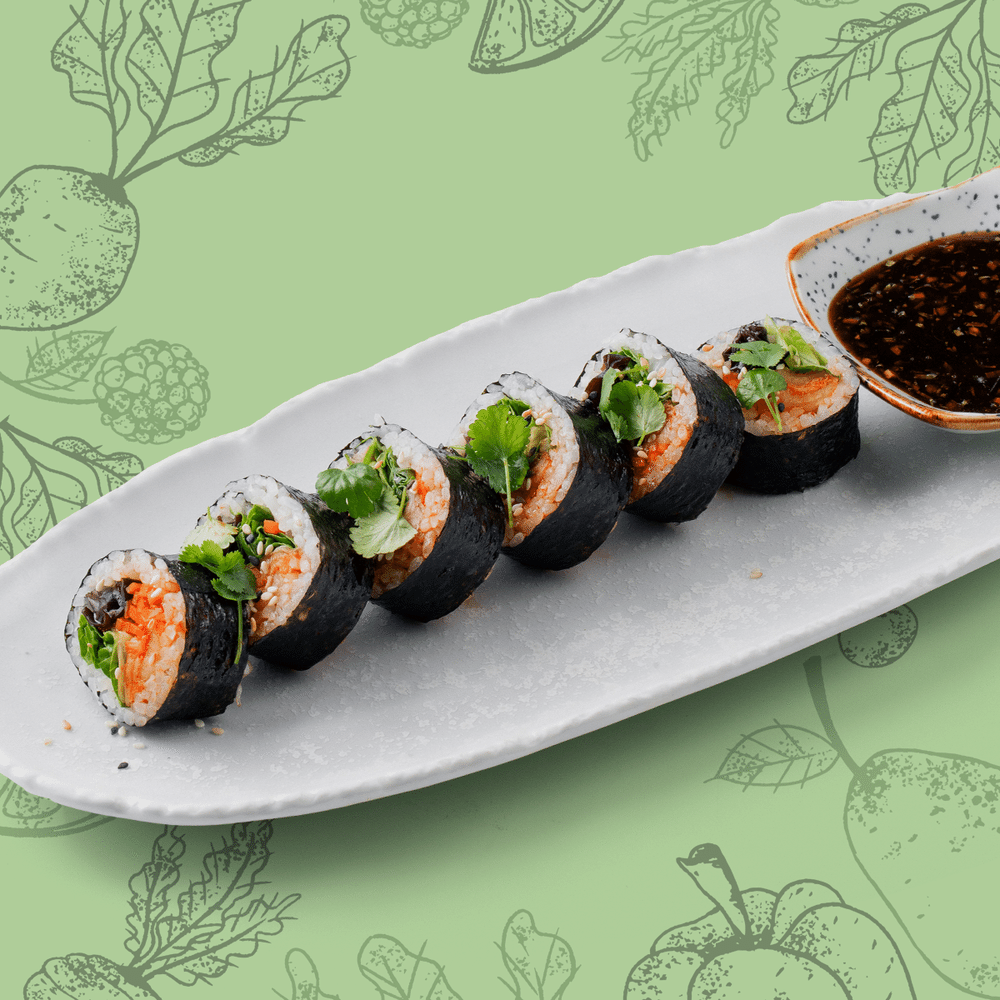 Рис, кунжутное масло, нори, морковь по-корейски, грибы моэр, капуста кимчи, салат ромейн, кунжут, микрозелень, соус тайский чили