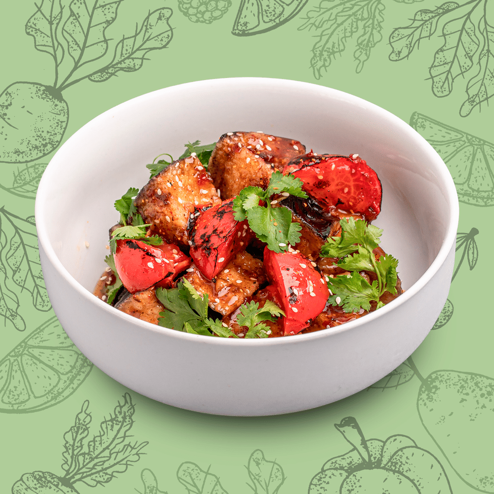 Баклажаны, томаты, кинза, кунжу, соус кисло-сладкий чили