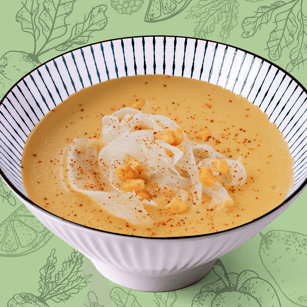 Кукуруза, кокосовое молоко, фенхель, тогараси, зеленое масло, репчатый лук, лук порей, масло растительное, вино белое, соевый соус, хондаши, аджинамото