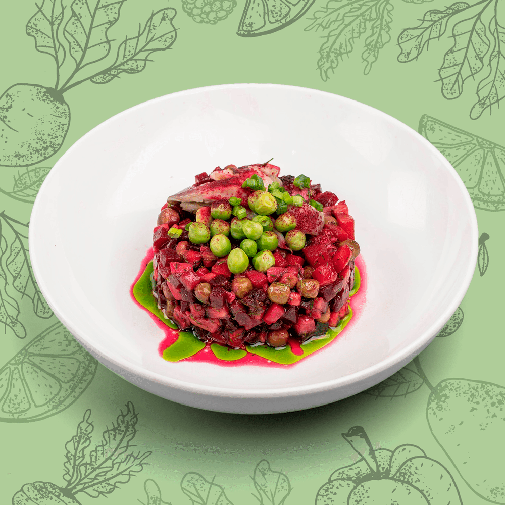 Картофель, морковь, свекла, авокадо, горошек, вешенки маринованные, масло нерафинированное, соль, перец, укроп, грузки маринованные, зеленое масло