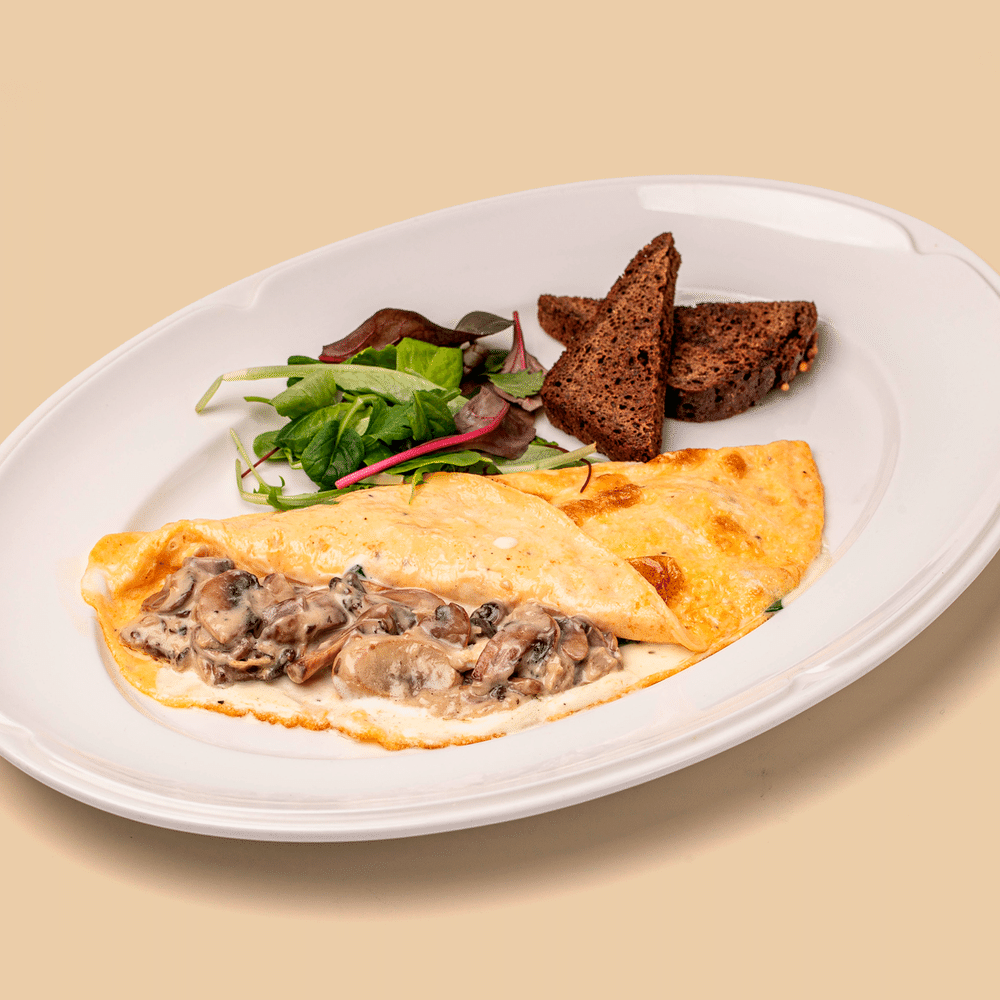 Яйцо куриное, репчатый лук, шампиньоны, сливки, соль, перец, моцарелла, бородинский хлеб, микс салатов